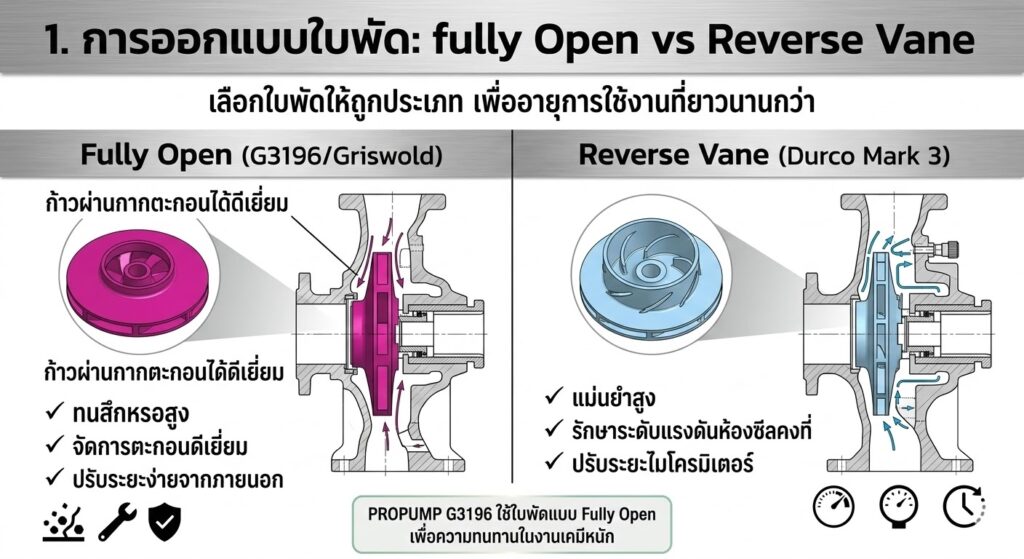 ปั๊ม ANSI ทั่วไปมักใช้ใบพัดแบบปิด (Enclosed) หรือกึ่งเปิด (Semi-Open) ซึ่งมีข้อจำกัดเมื่อเจอของแข็ง แต่ G3196 เลือกใช้ระบบที่ดีที่สุด:
