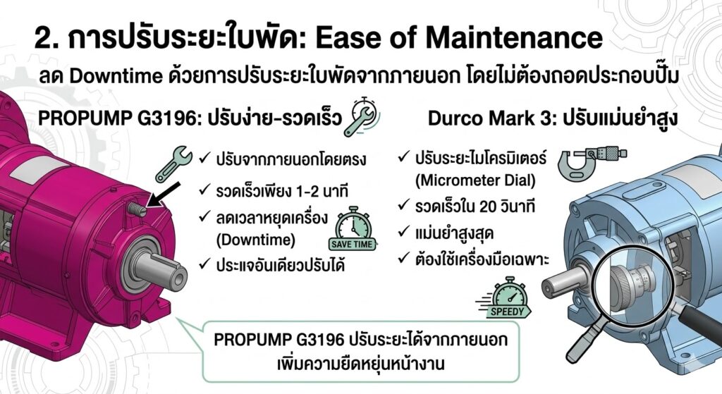 กู้คืนประสิทธิภาพได้ง่าย: สามารถปรับระยะห่างใบพัด (Clearance) จากภายนอกได้ง่าย เพื่อให้ปั๊มกลับมามีประสิทธิภาพเหมือนใหม่ แม้จะผ่านการใช้งานจนสึกหรอ