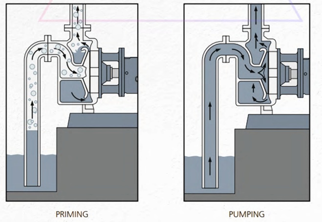 1. ช่วงล่อน้ำและไล่อากาศ (Priming Cycle) เมื่อเปิดเครื่อง ใบพัดจะตีผสมของเหลวที่เหลือค้างอยู่ในตัวเรือน (หลังจากการเติมครั้งแรก) เข้ากับอากาศที่ถูกดูดเข้ามาจากท่อดูด ส่วนผสมของน้ำและอากาศนี้จะถูกดันขึ้นไปยังห้องแยกอากาศ (Separation Chamber) ที่อยู่ด้านบนของตัวเรือน
